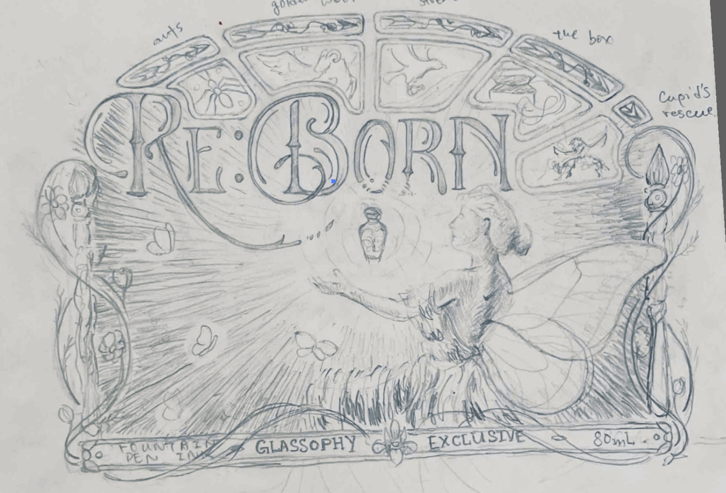 The ink is envisioned as Ambrosia, the divine reward for Psyche after her trials, celebrating her resilience and rebirth through the motif of the butterfly, while delicate flowers—metaphors for Psyche herself—encircle an arrow representing her enduring romance with Cupid.